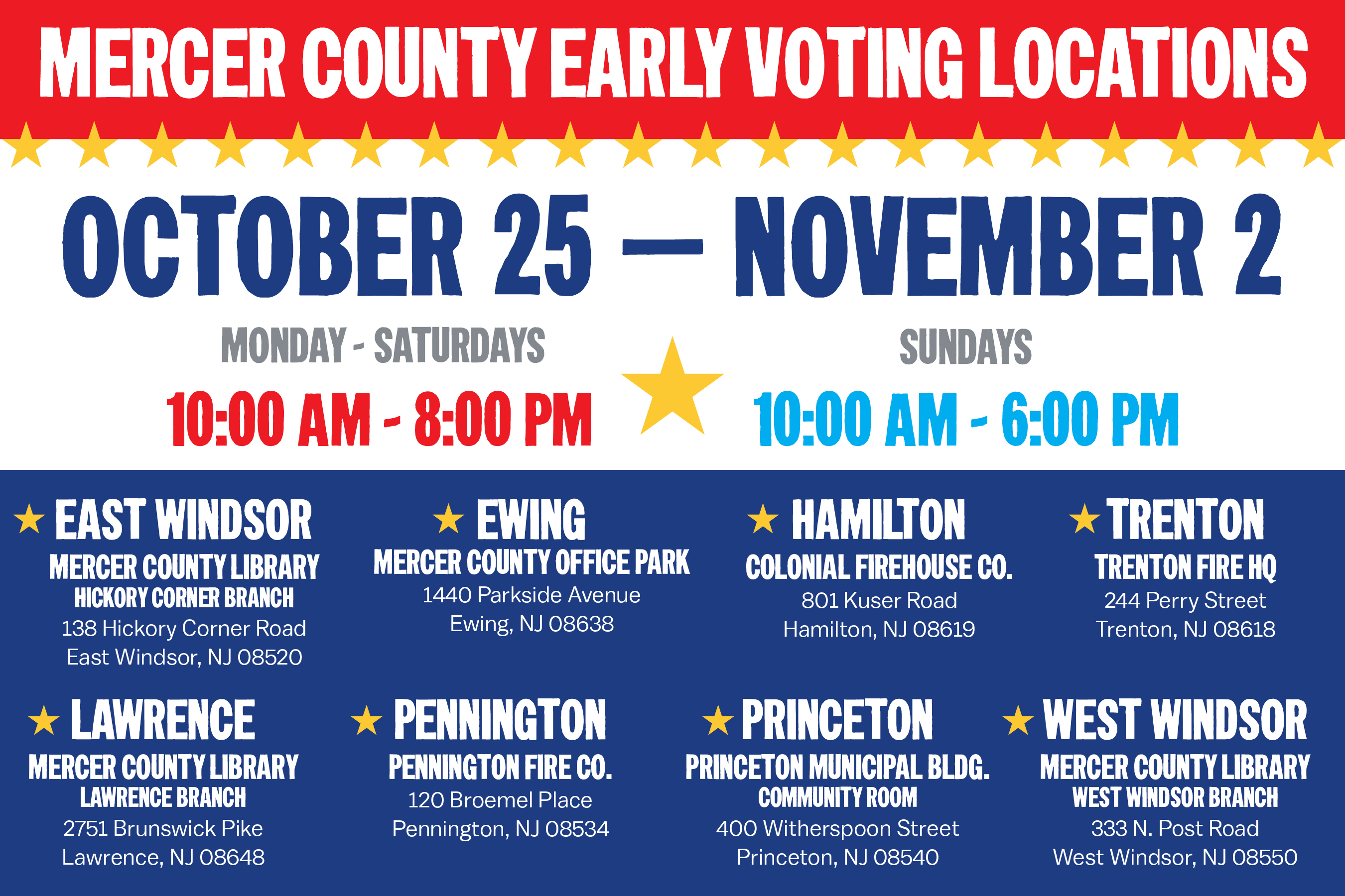 Want to serve your community and help make elections possible, while earning up to $300? Consider becoming an Election Board Worker! The Mercer County Board of Elections is actively recruiting for new Election Board Workers (must be registered Mercer County voters or students 16-17 years old). Bilingual residents who speak English, as well as Gujarati, Hindi, Mandarin, Punjabi, or Spanish fluently are especially needed. Additional details can be found here.