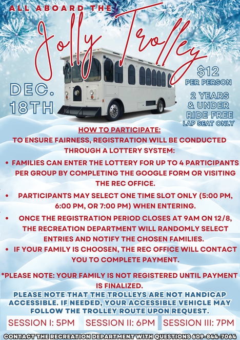 Hop on for a magical evening on Thursday, December 18 aboard a Victorian style trolley. Enjoy the Jolly Trolley Ride, a 45 minute tour through Lawrence Township featuring the best holiday house lights and festive displays around town. It is a warm, nostalgic ride that captures the season as you roll past glowing homes and cheerful decorations. To keep things fair, participation will be selected by lottery.