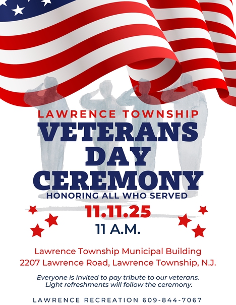 Join Lawrence Township as we honor the brave men and women who have served our country. The Veterans Day Ceremony pays tribute to all who wore the uniform and protected our freedoms. Light refreshments will be provided following the ceremony.